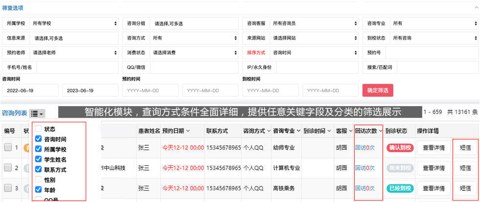查詢組合條件豐富,界面展現(xiàn)可自定義;針對競價需要看關(guān)鍵詞,來源渠道;針對咨詢需要看電話號碼,預(yù)約時間;針對網(wǎng)咨、面咨需要看預(yù)約備注;可自定義展現(xiàn)。